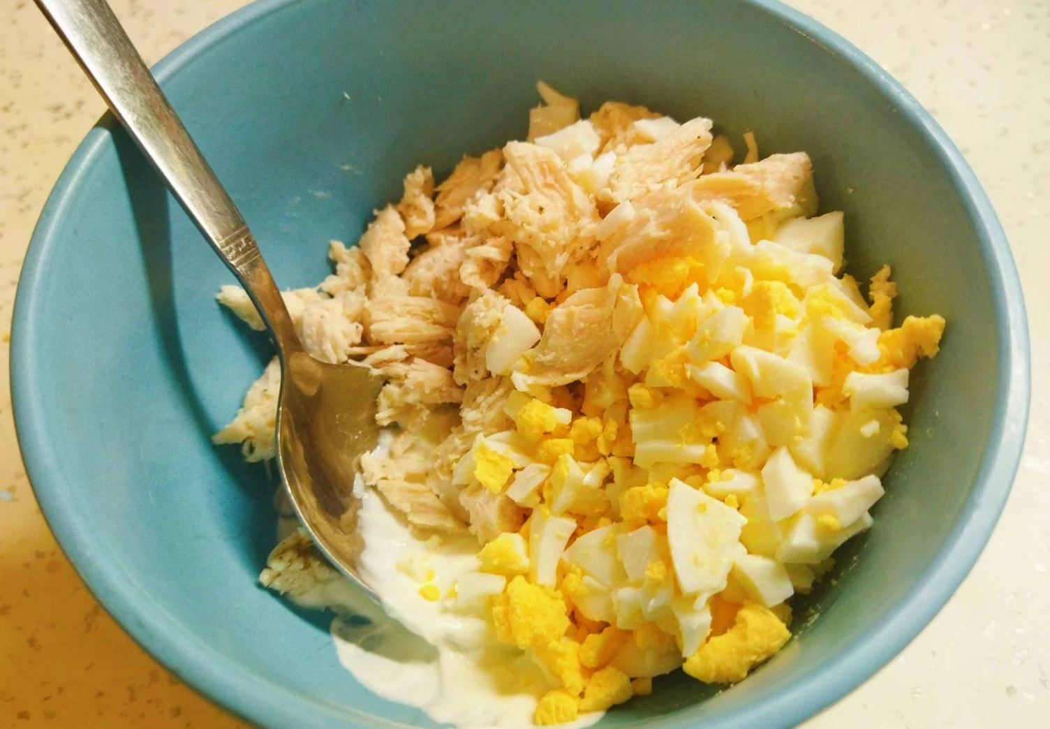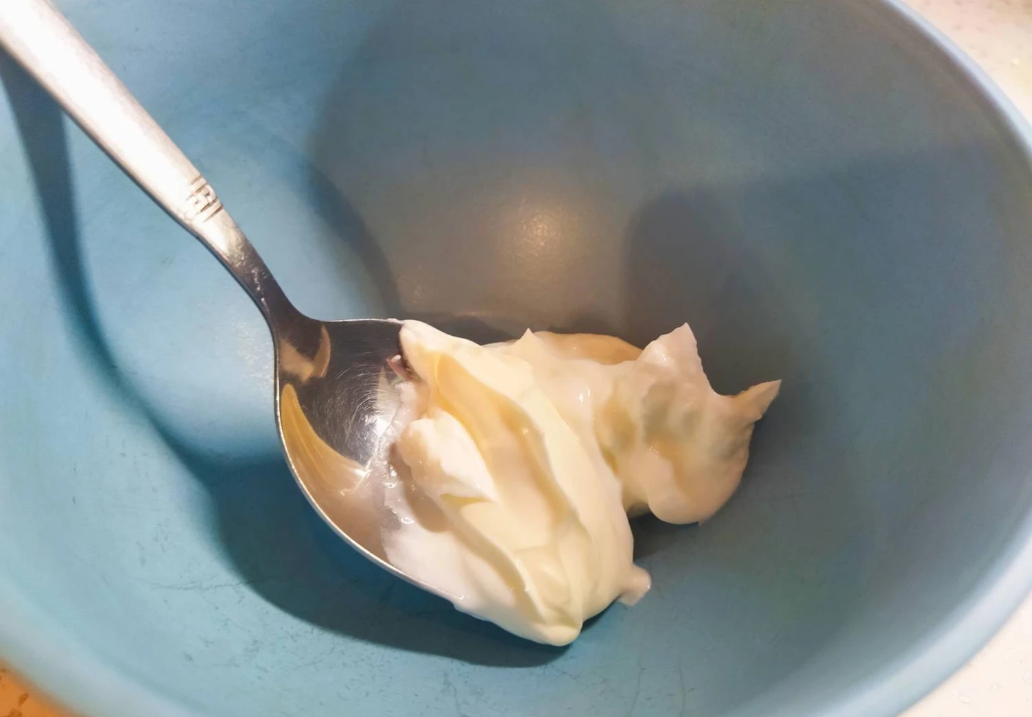 В миске смешать в равных частях майонез и несладкий греческий йогурт (я добавила по пол столовой ложки того и другого, можно чуть больше/меньше по вашему вкусу).