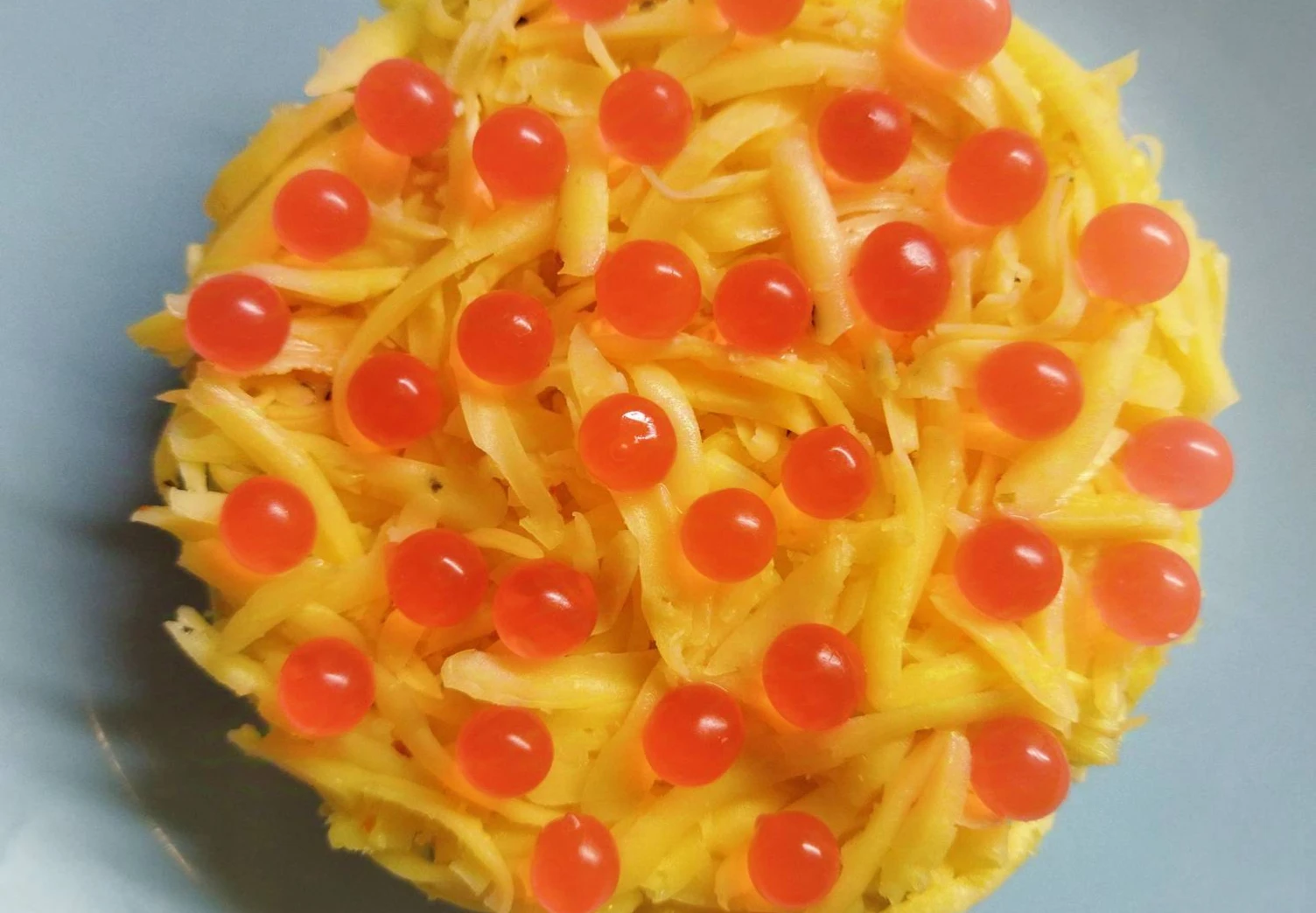 Рецепт от нашей читательницы Марины. "Нежный салат с изюминкой. Вы любите салат с курочкой и сладким дополнением (ананасом/яблоком/черносливом)? Тогда вы полюбите и эту необычную версию со сладкой ноткой и интересной текстурой лопающихся шариков с соком. P. S. Я брала джусболлы со вкусом персика, но на самом деле хорошо подойдут любые фруктовые или ягодные джусболлы."