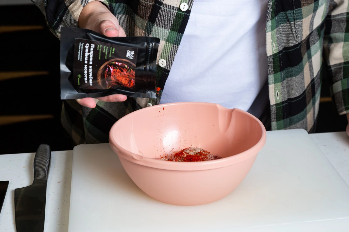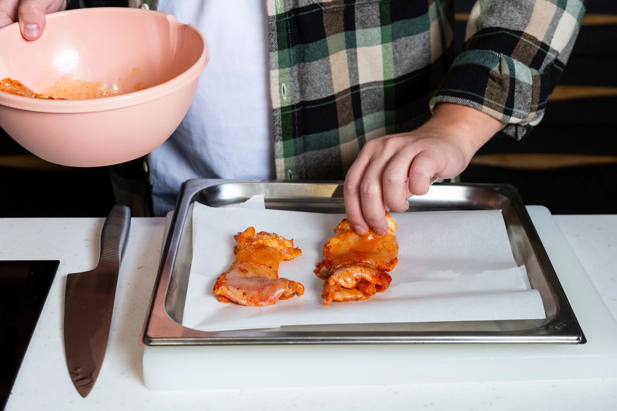 Выложите филе бедра в миску. Добавьте соль, копчёную паприку, чёрный молотый перец, сухой чеснок и масло. Перемешайте и оставьте мариноваться на 30-40 минут.