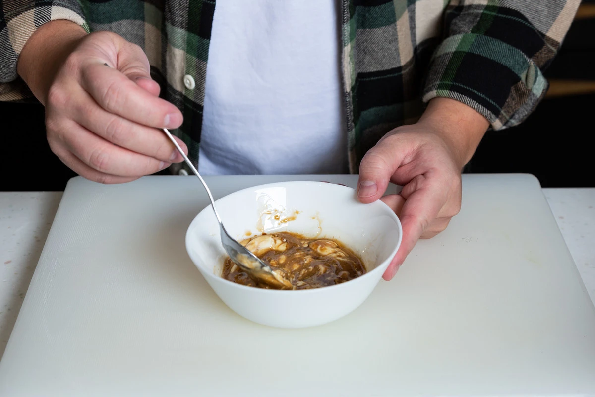 Сделайте заправку: смешайте в миске сметану, кунжутное масло и соевый соус.