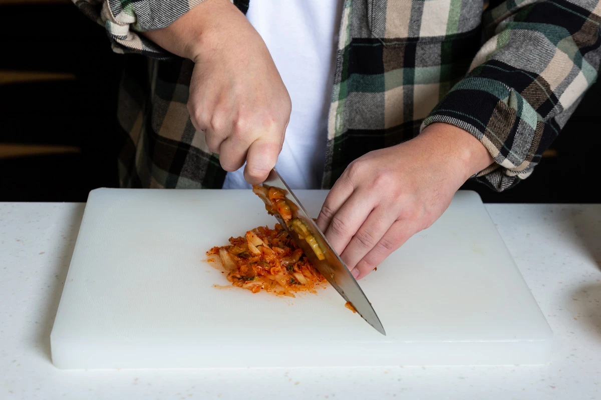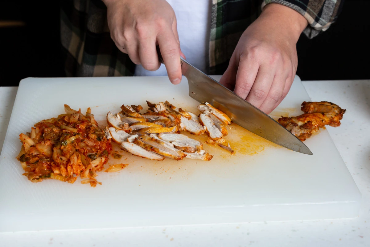 Кимчи выложите из упаковки и нарежьте соломкой.