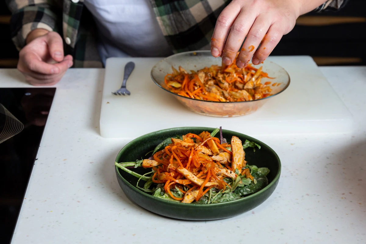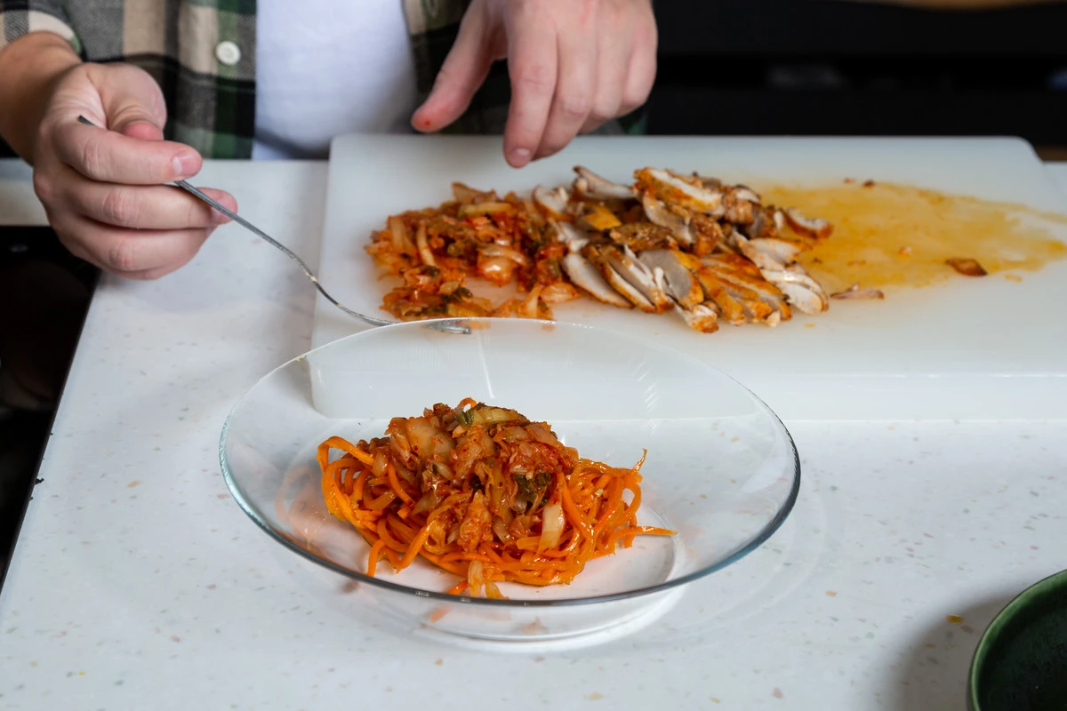 Выложите в миску корейскую морковь. Добавьте нарезанную курицу и кимчи. Перемешайте.