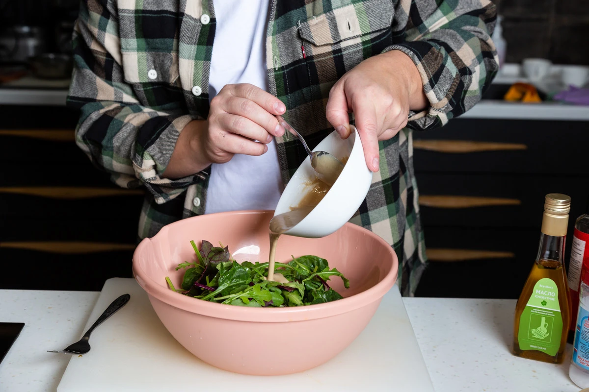 Салатные листья промойте и обсушите. Выложите в миску и смешайте с заправкой.