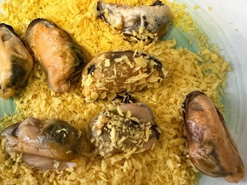 Если небходимо, мидии разморозьте в холодильнике, а после обжарьте их в сухарях на растительном масле, до появления хрустящей корочки.