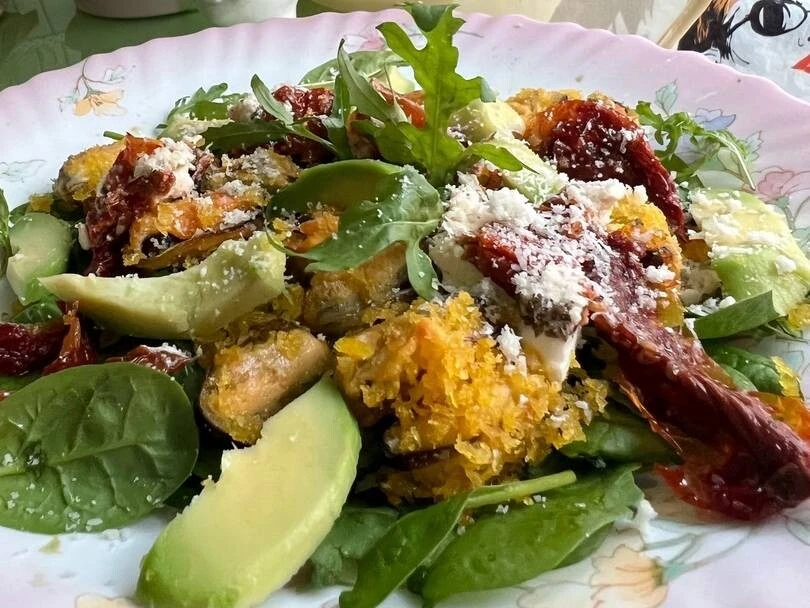 Выложите в блюдо салатный микс зелени и добавьте туда нарезанные вяленые томаты.