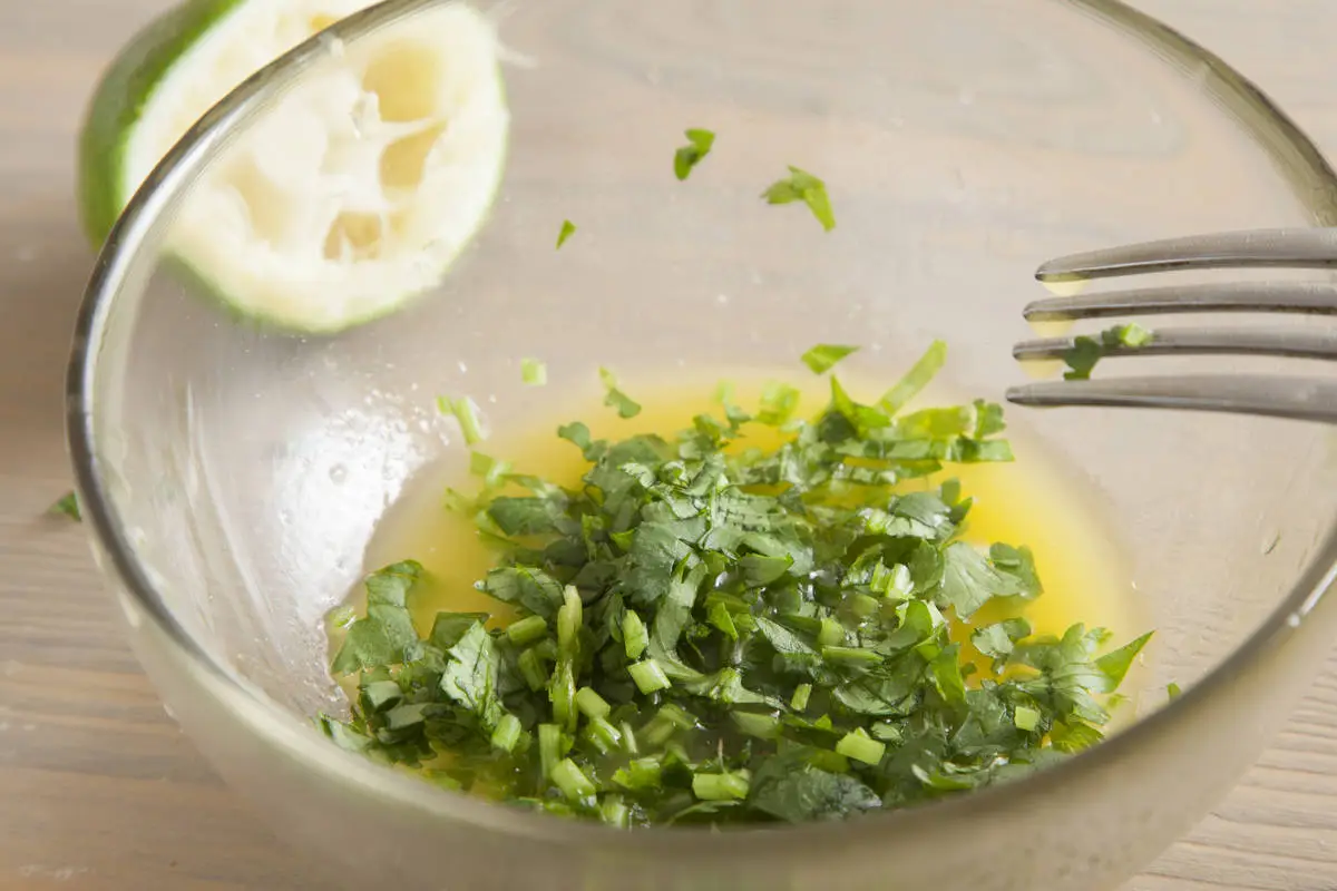 Для заправки выдавите сок лайма, смешайте с таким же количеством оливкового масла и взбейте вилкой, посолите, поперчите, добавьте мелко порубленные чеснок и кинзу, перемешайте. Полейте салат заправкой и подавайте!