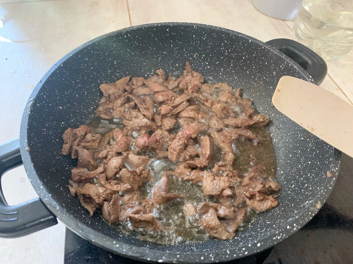 Печень нарезаем небольшими кусочками и обжариваем на растительном масле. Убираем со сковороды.