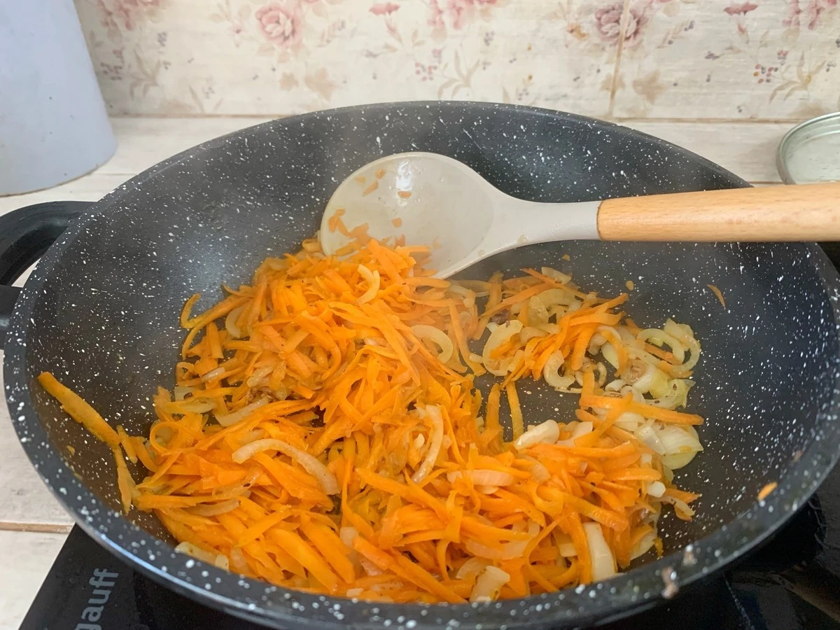 Морковь трём на крупной тёрке, а лук режем полукольцами. Обжариваем отдельно лук с морковью в той же сковороде, где жарили печень.