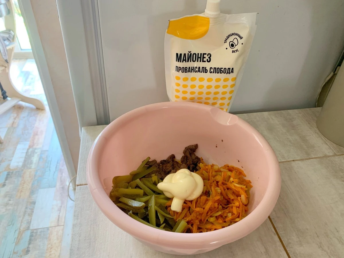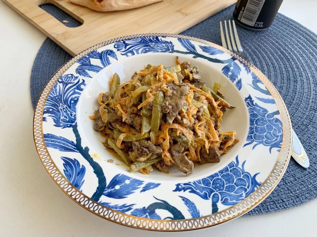 Соединяем обжаренную печень и овощи. Нарезаем огурцы соломкой и добавляем к печени с овощами.