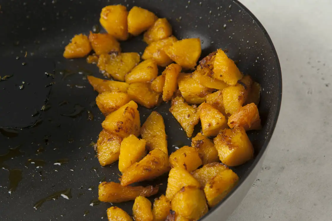 Тыкву нарежьте кубиками, посолите, сбрызните маслом, обваляйте в смеси специй и запеките в духовке при 190 °C около 20 минут до мягкости. Также можно обжарить тыкву на сковороде.