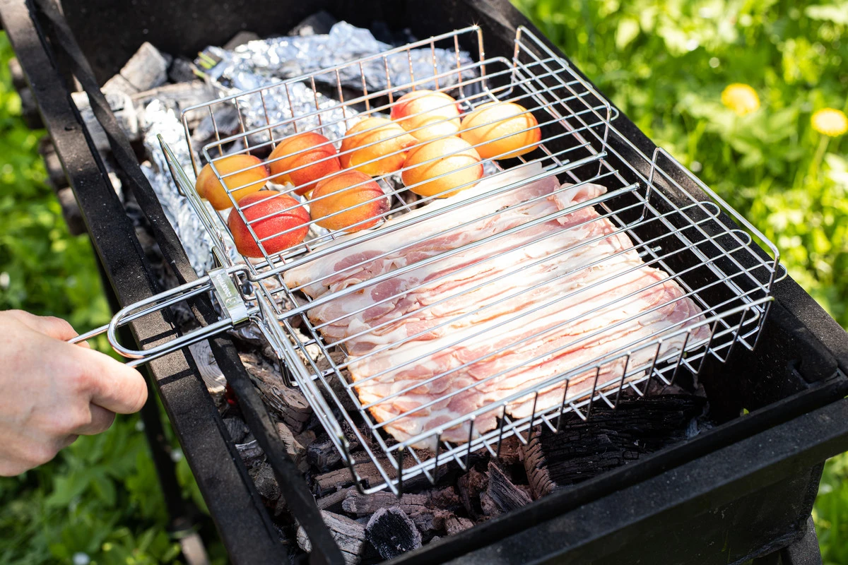 Выложите бекон и персики на решётку с прижимной крышкой. Жарьте над углями около 8-10 минут, периодически переворачивая. Будьте осторожнее с капающим от бекона жиром, снимайте решётку с мангала, если жир вспыхивает.