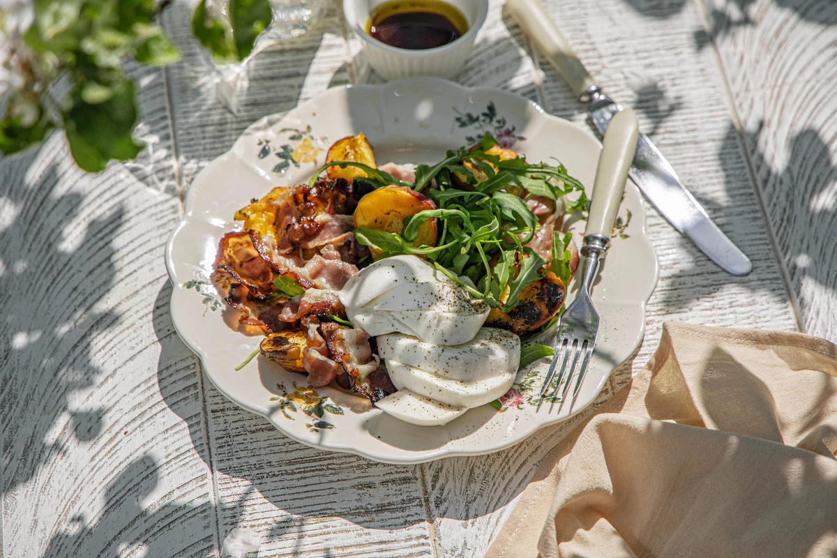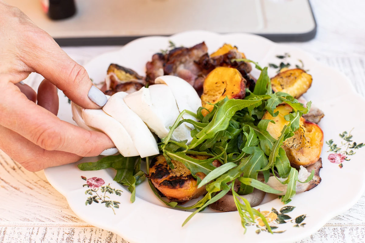 В салатник выложите руколу, добавьте нарезанную моцареллу, печёные персики и бекон.