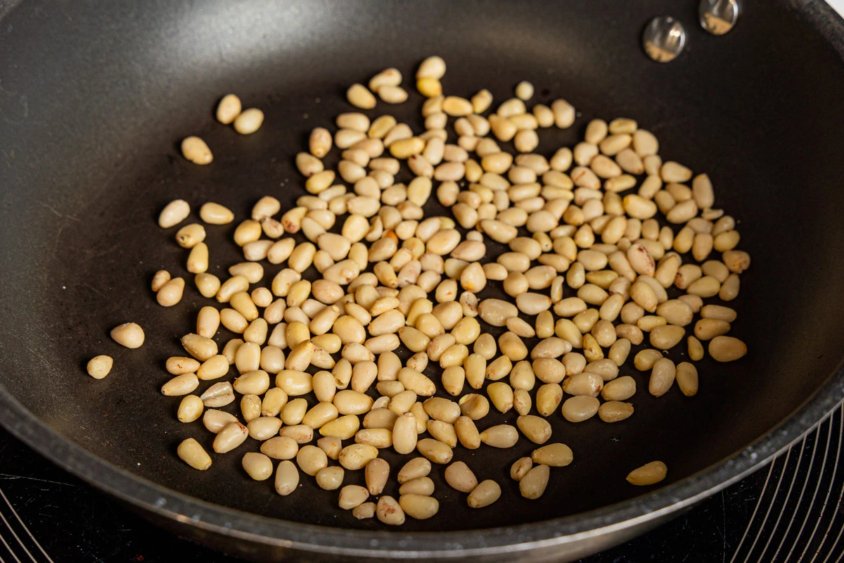 Слегка обжарьте на сухой сковороде кедровые орешки.