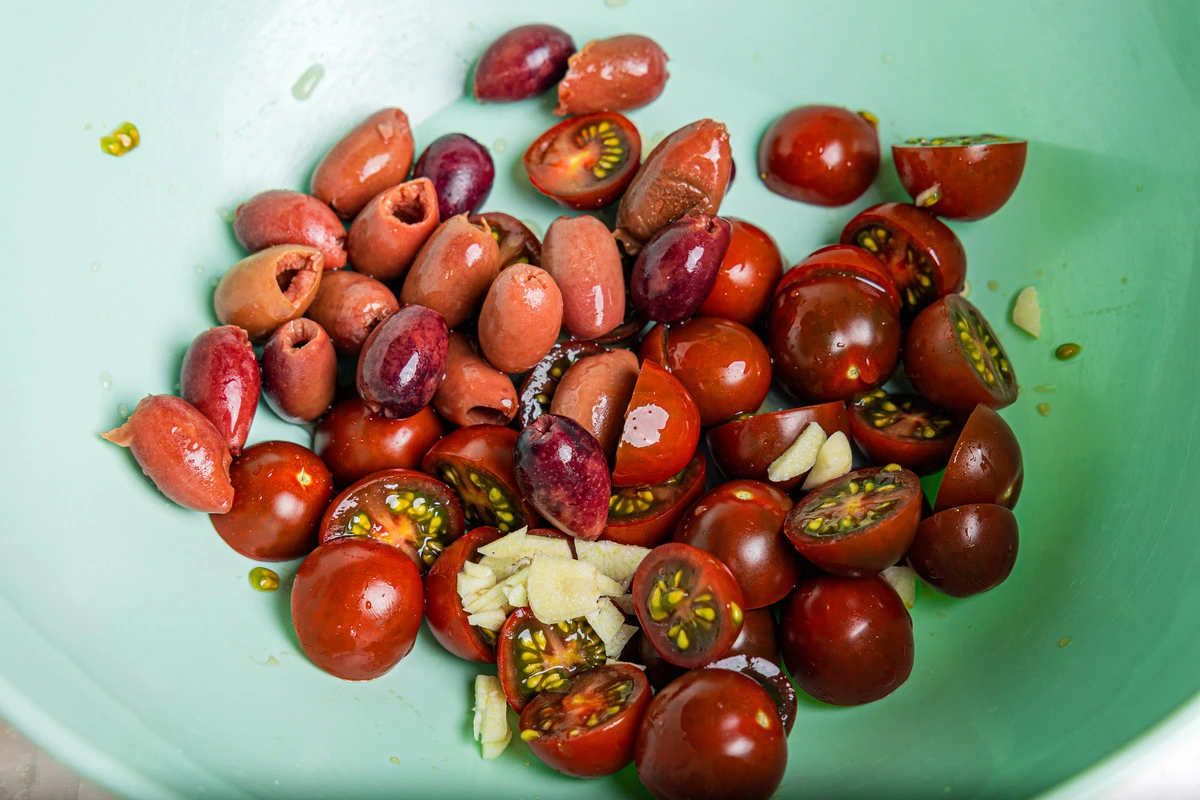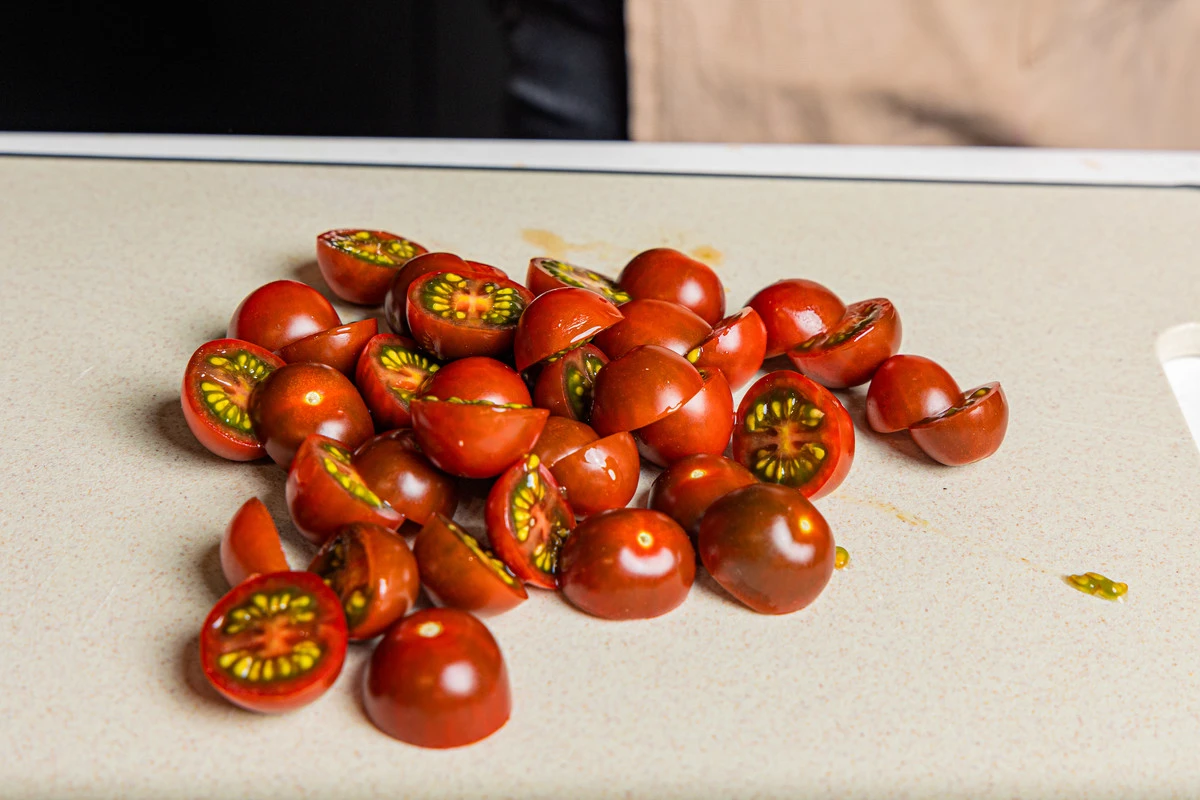 Черри помойте, обсушите и нарежьте пополам, положите в миску.