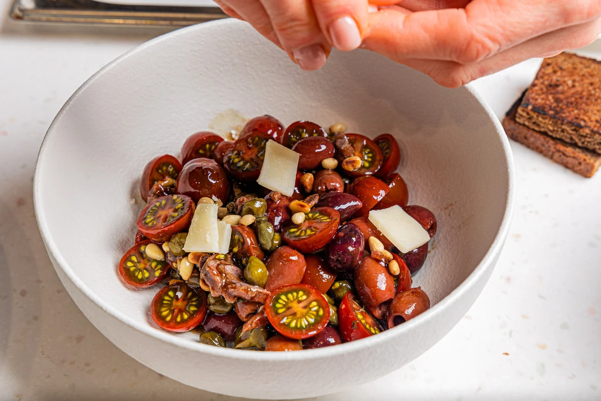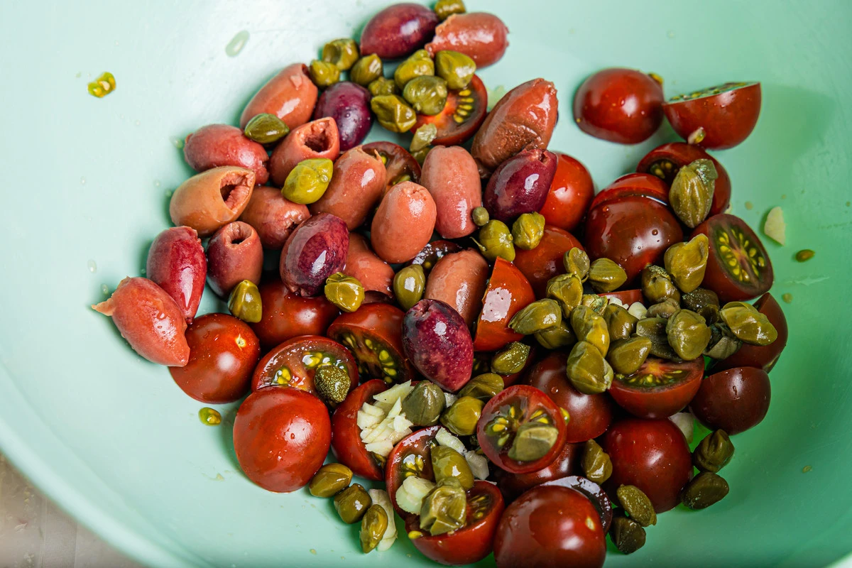 Добавьте оливки или маслины, каперсы и нарезанный чеснок.