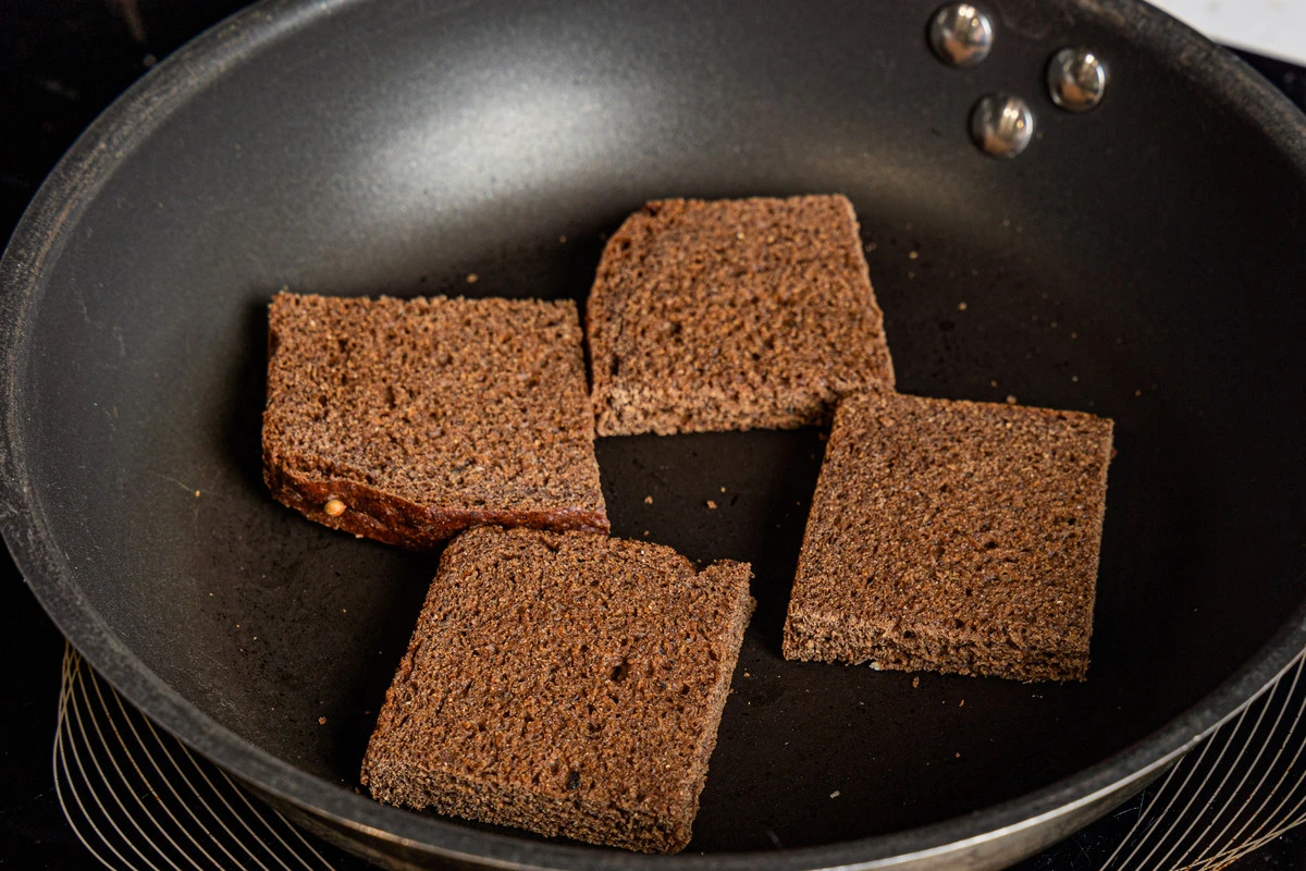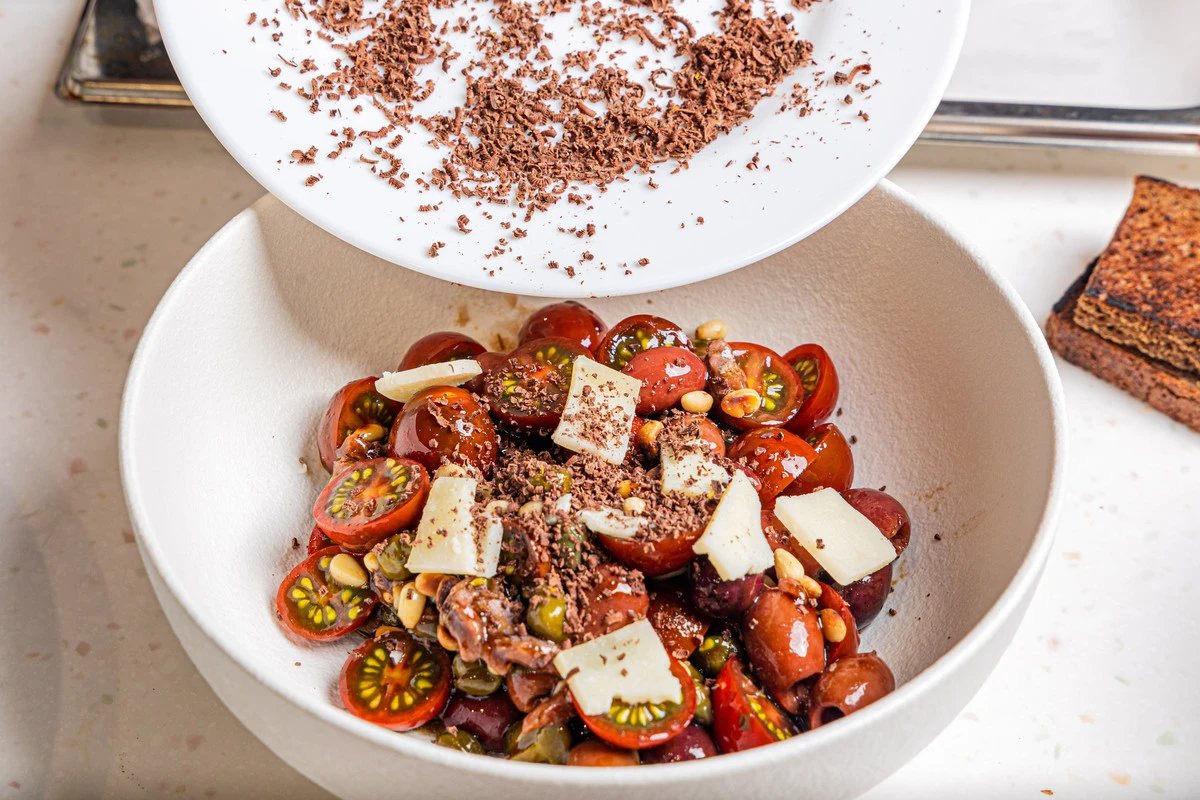 Измельчите на мелкой тёрке шоколад и посыпьте салат. Украсьте ломтиками подсушенного хлеба, базиликом и подавайте.