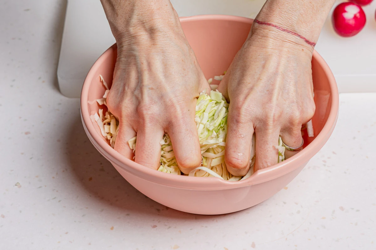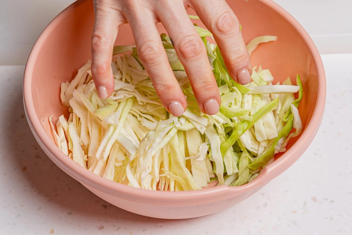 Добавьте соль, помните капусту руками и перемешайте — это нужно, чтобы она стала мягче и сочнее.