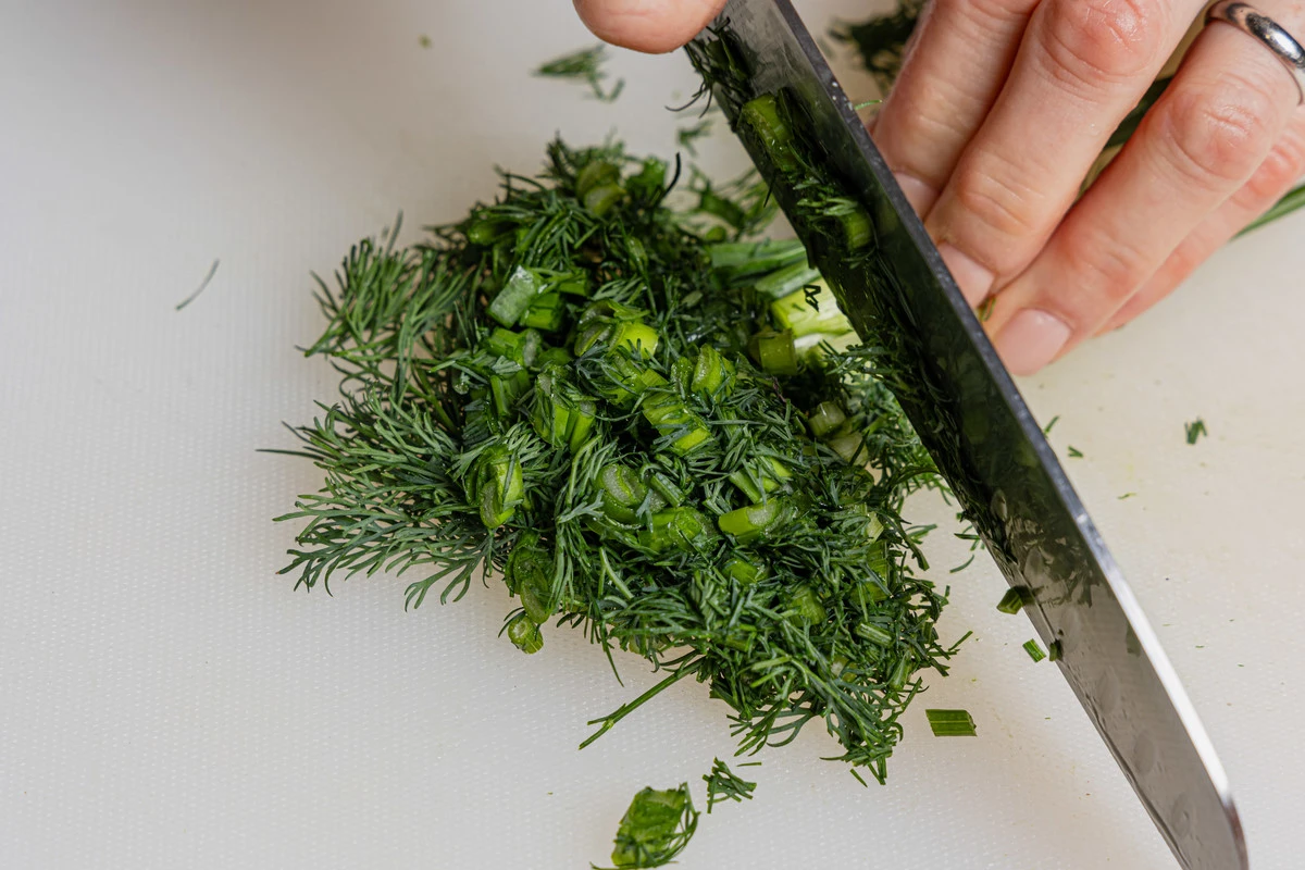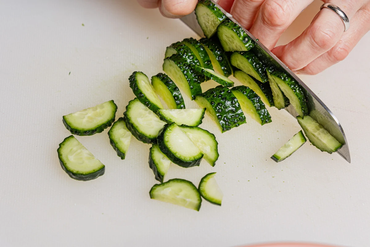 У огурцов удалите плодоножки и нарежьте ломтиками, как редиску.