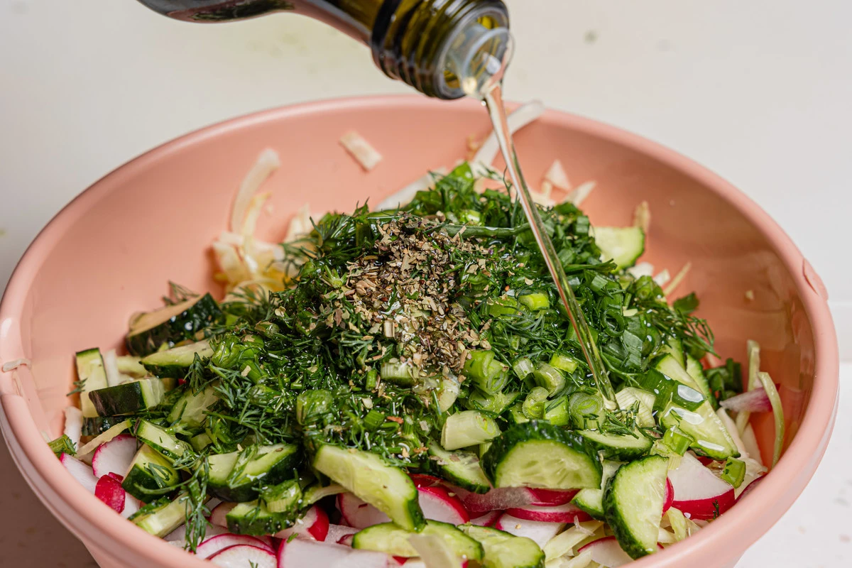 Добавьте огурцы и укроп к остальным ингредиентам. Всыпьте орегано и базилик, поперчите по вкусу. Налейте нерафинированное масло.