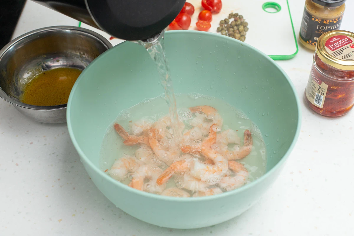 Креветки разморозьте, ошпарьте кипятком и дайте воде стечь.