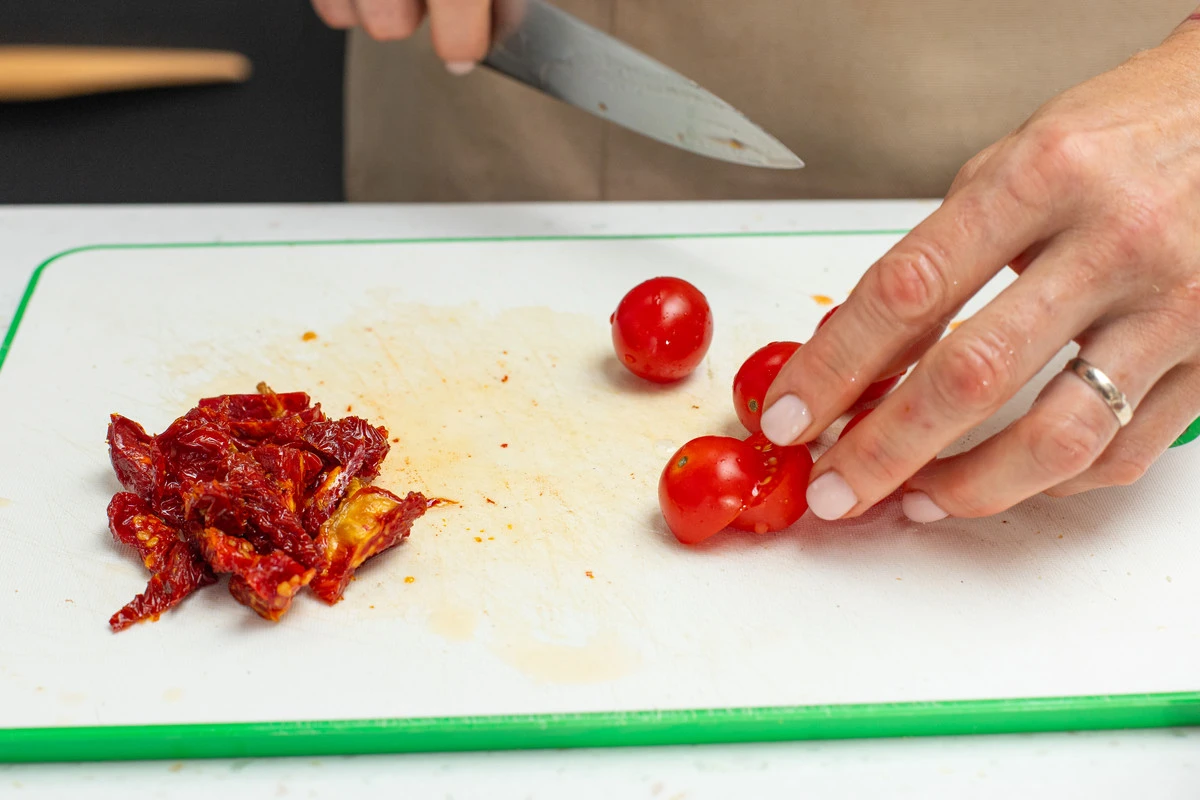 Нарежьте вяленые томаты кусочками, помидоры черри разрежьте пополам.