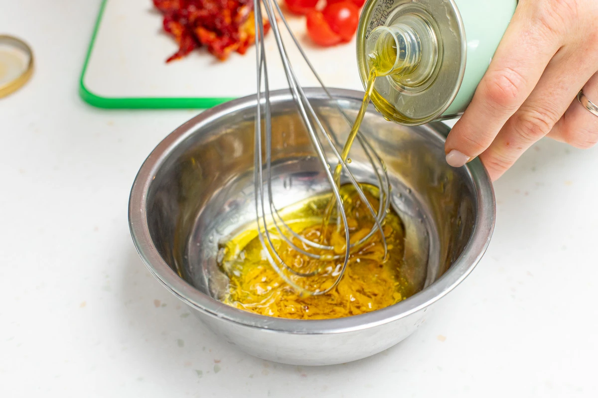 Приготовьте заправку для салата: смешайте в мисочке горчицу, соль, сок лимона, мёд, оливковое масло и взбейте венчиком до однородности. Руколу замочите в воде на 5 минут и обсушите.