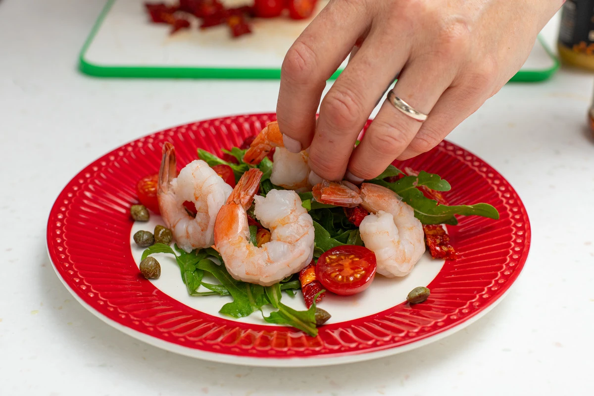Выложите на тарелку руколу. Сверху — вяленые томаты, помидоры черри, каперсы и креветки.