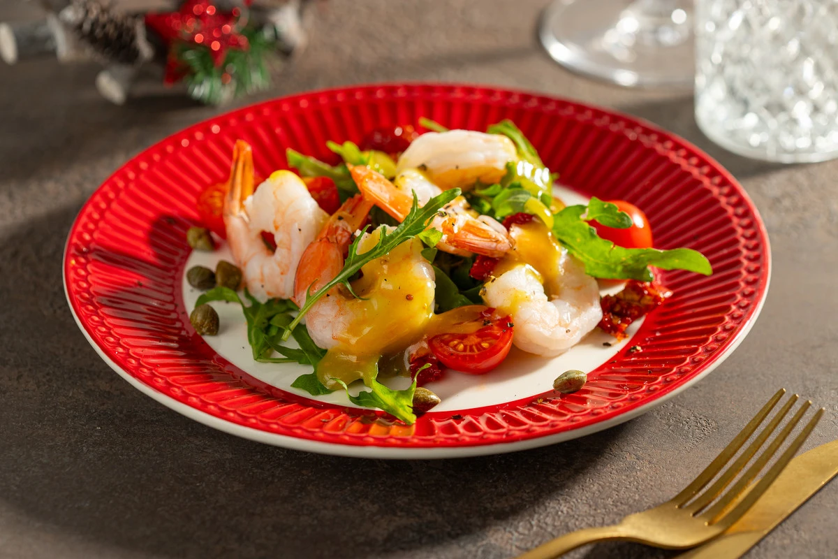 Вкусный и лёгкий салат из креветок с руколой не содержит майонеза. Он украсит ваш праздничный стол своими яркими красками или дополнит домашний обед или ужин. Возьмите для этого рецепта бланшированные очищенные королевские креветки, и вам даже не придётся ничего варить или обжаривать.