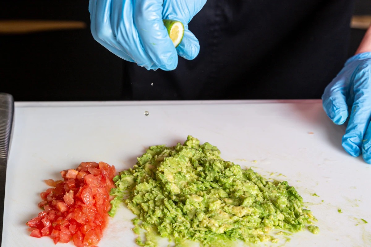 Приготовьте гуакамоле: авокадо разомните, полейте соком лимона, добавьте порезанный помидор, растительное масло, соль и перец. Перемешайте.