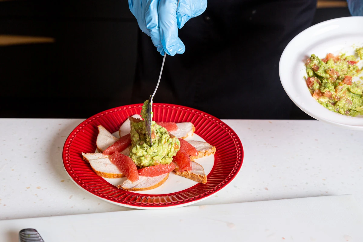 На блюдо в один слой, чередуя, выложите грейпфрут и ломтики рулета. Сверху распределите гуакамоле и украсьте корном.