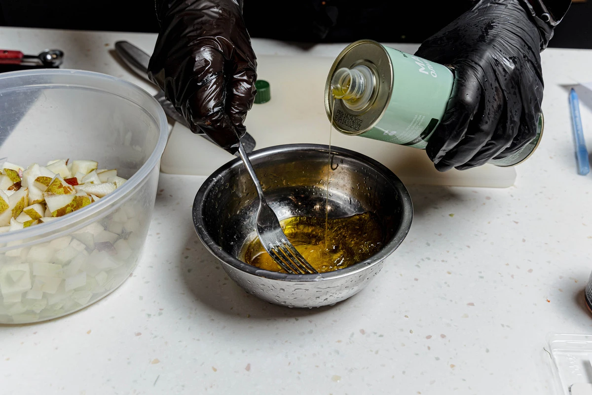 Кольраби и грушу нарежьте тонкой соломкой, сбрызните апельсиновым соком и перемешайте.
