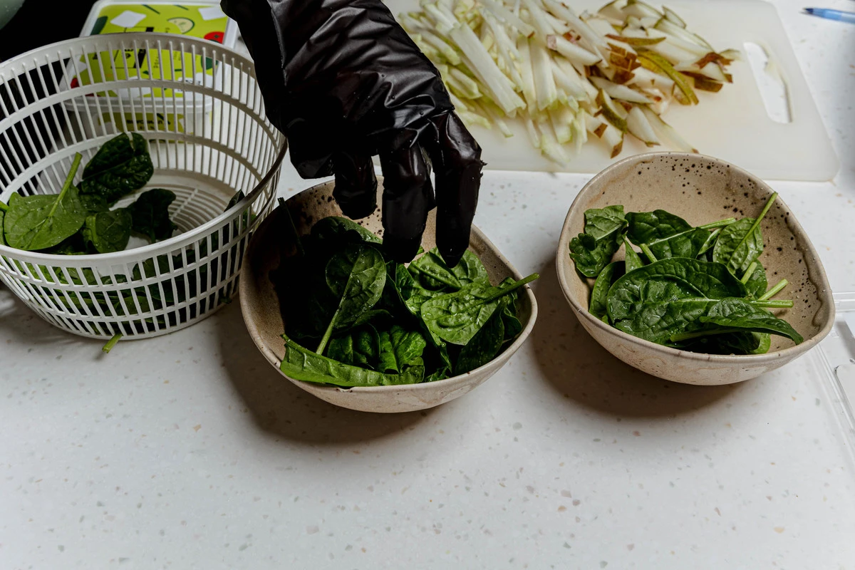 В салатник или порционные тарелки выложите шпинат, сверху соломку из кольраби и груши.