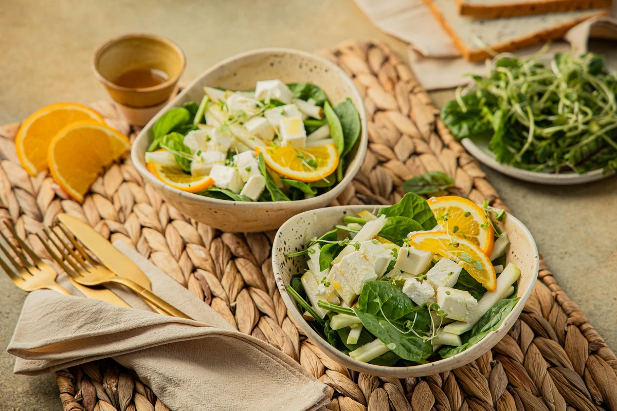 Выложите кубики феты, полейте салат заправкой и добавьте тонкие ломтики апельсина.