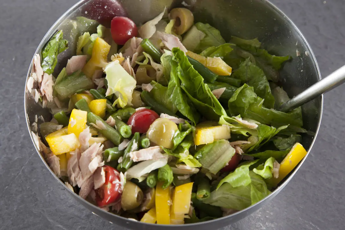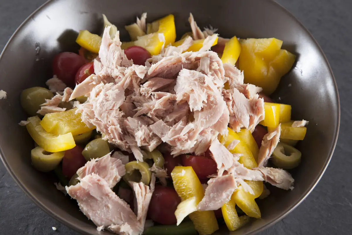 Яйца очистите от скорлупы, разрежьте каждое пополам. Болгарский перец нарежьте полукольцами, помидоры черри – половинками. Тунца выньте из банки и разомните вилкой. Оливки нарежьте кружочками.