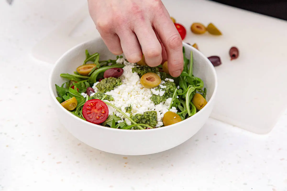 Руколу выложите в салатник, сверху положите творог, оливки и черри.