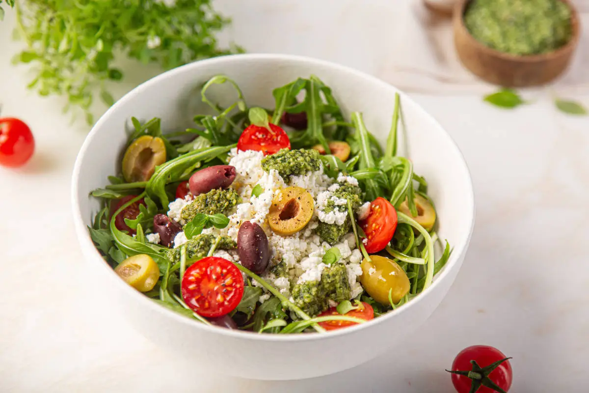 В обычный салат в средиземноморском стиле мы предлагаем добавить зернёный творог. Получается очень вкусно и сытно, такой салат хорош и на завтрак, и на ужин, и даже в качестве лёгкого обеда, особенно в жаркую погоду.