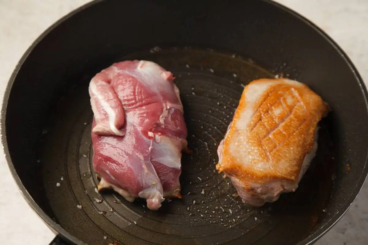 Сделайте сеточку надрезов на утиной коже с помощью острого ножа, натрите солью с обеих сторон. Жарьте на сухой сковороде кожей вниз около 10-15 минут, затем переверните и прижарьте с другой стороны до корочки. Уберите мясо с огня, накройте крышкой и дайте «дойти».