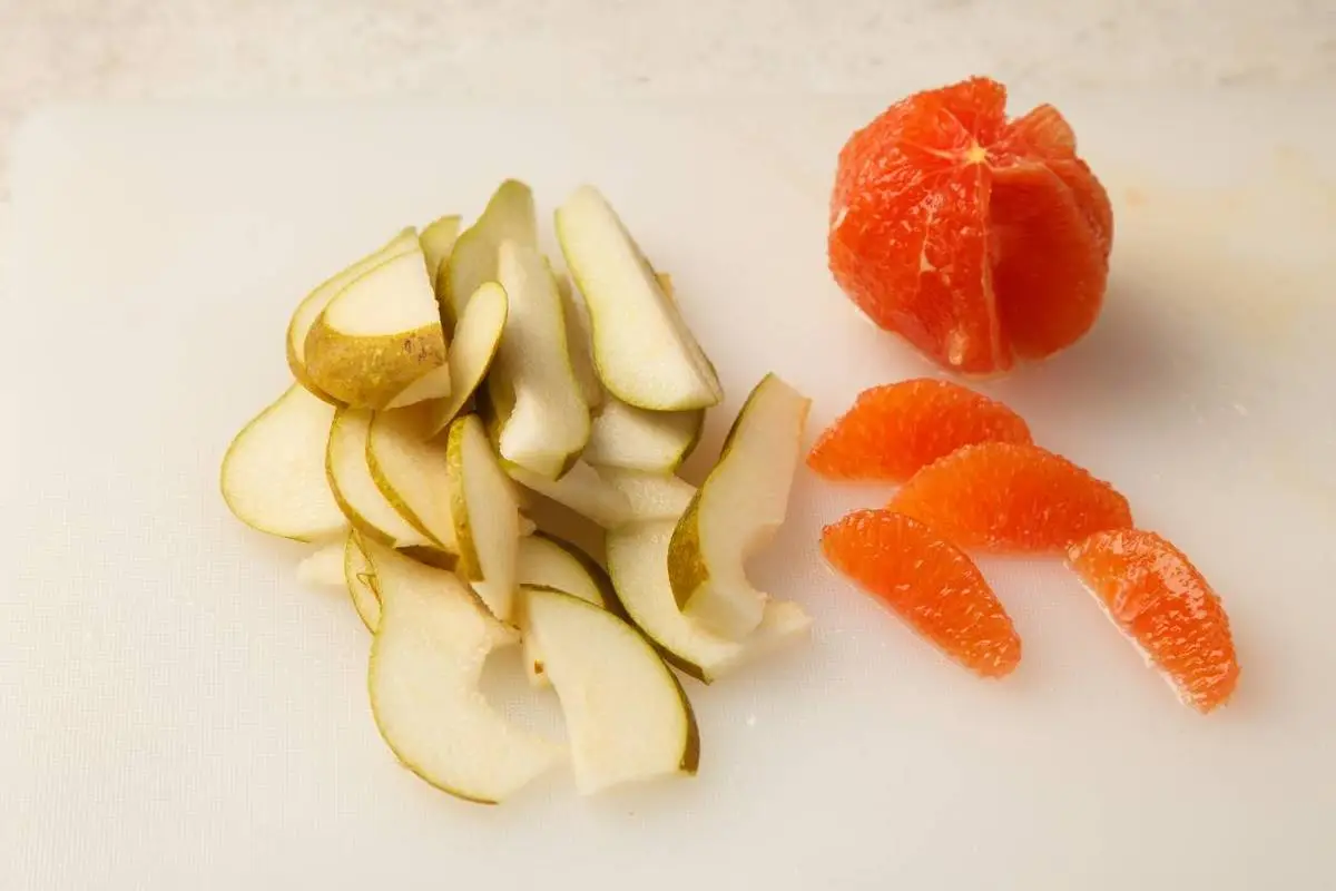 Апельсины очистите от кожуры и вырежьте дольки мякоти без плёнок. Грушу нарежьте тонкими ломтиками, сбрызните апельсиновым соком.