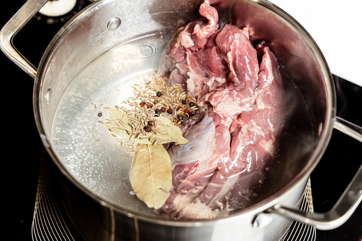 Баранину отварите до готовности, добавив в воду чёрный перец горошком и лавровый лист. Мясо выньте и остудите. Бульон можно использовать как основу для супа. Кстати, мясо можно не отваривать, а запечь в рукаве в духовке, тогда вкус получится более ярким.