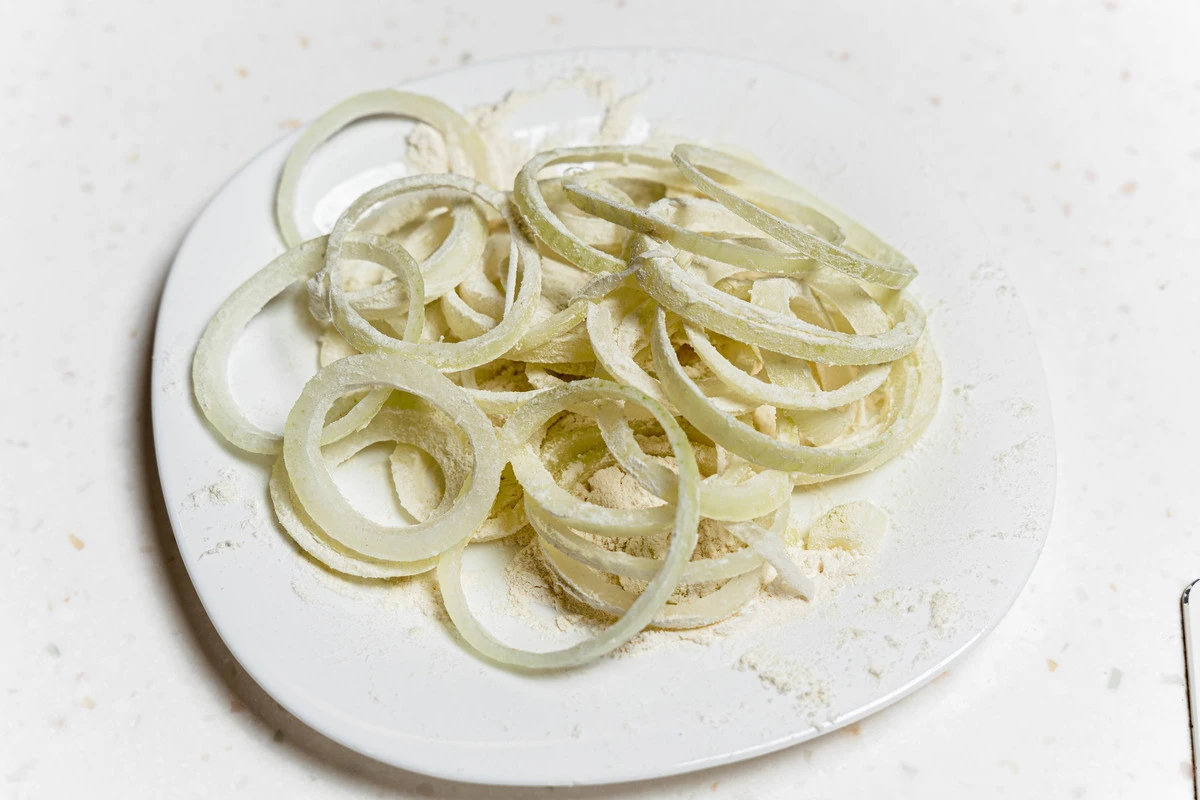 Лук нарежьте кольцами, обваляйте в муке.