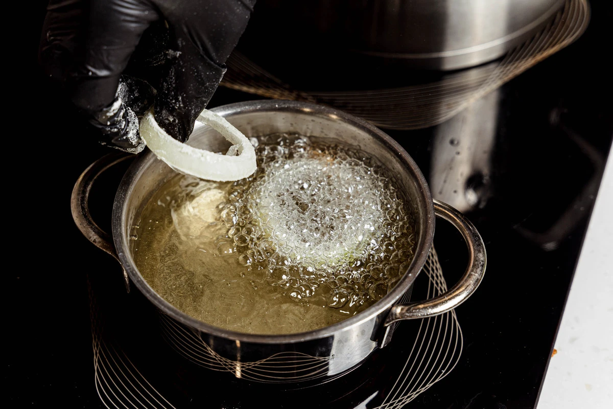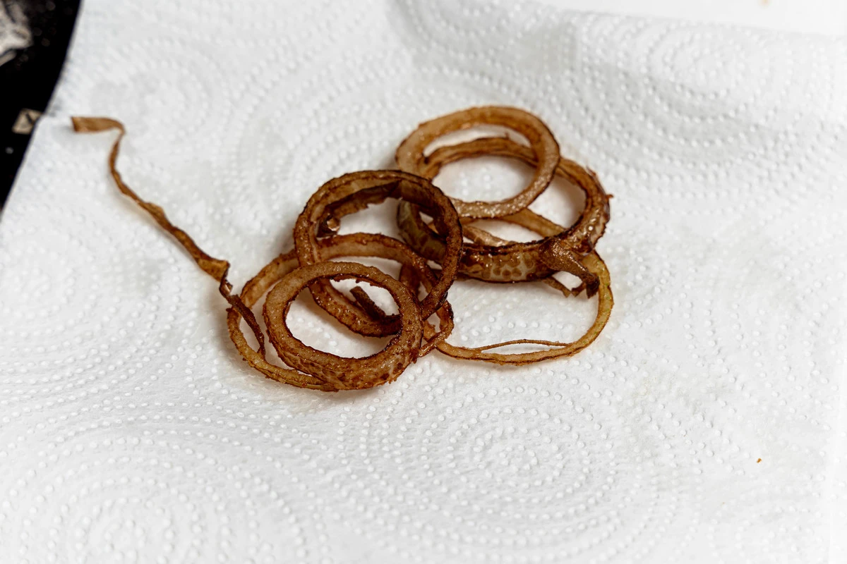 Готовые луковые кольца выложите на салфетки, чтобы убрать лишнее масло.