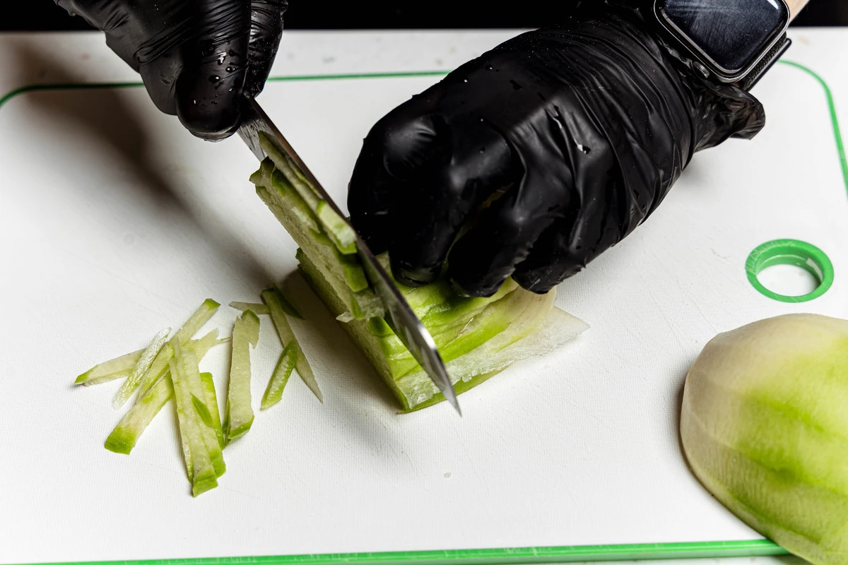 Редьку очистите от кожуры и нарежьте тонкими брусочками.