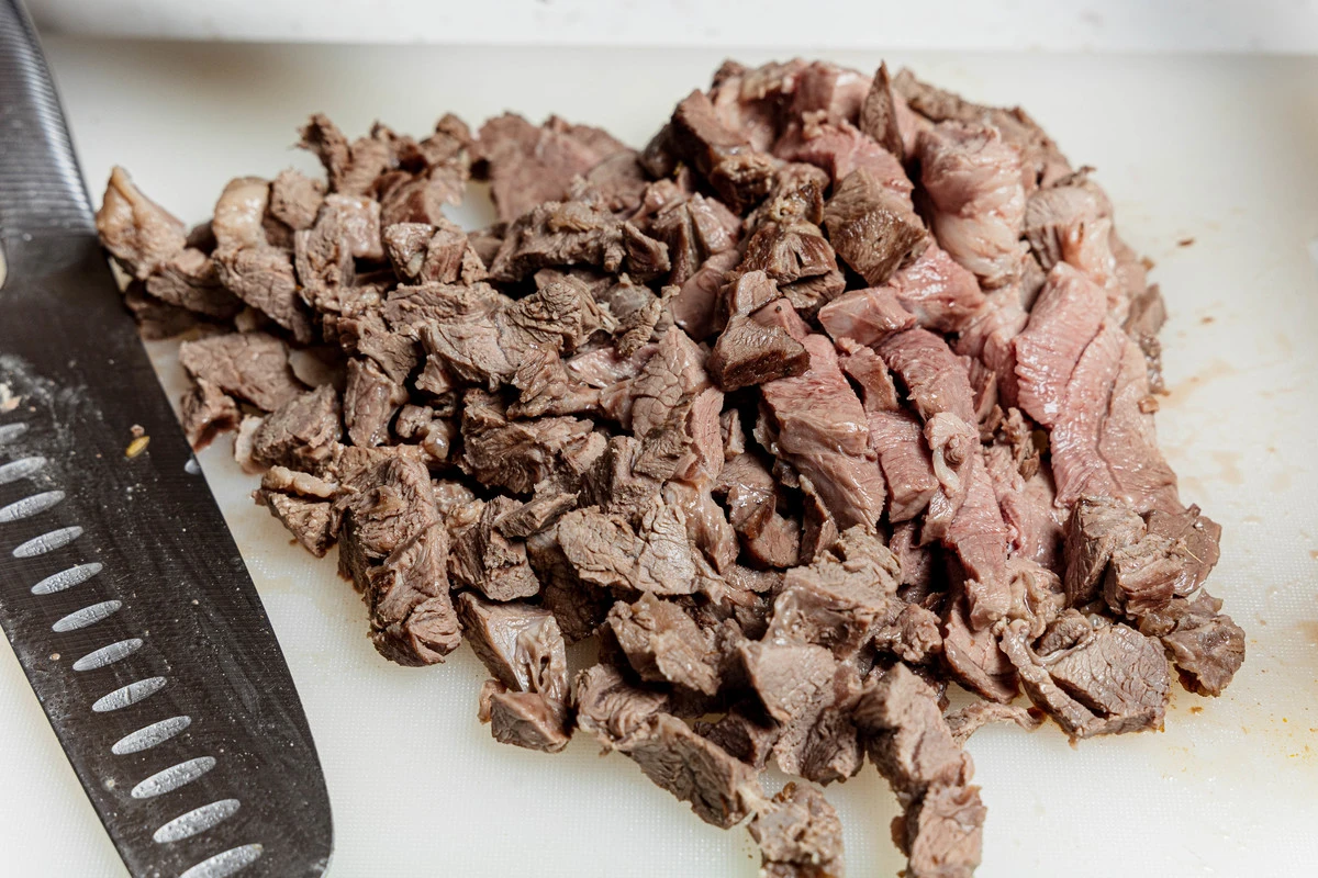 Отваренное мясо нарежьте кубиками или тонкими пластинками.