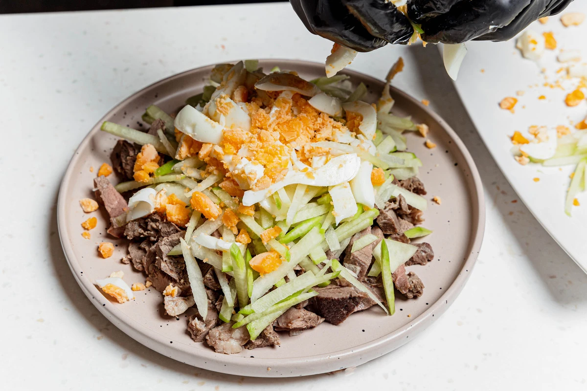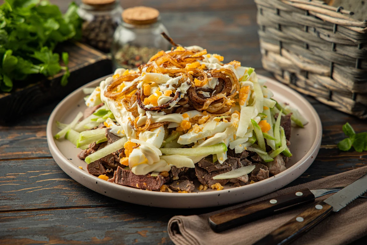 Салат «Ташкент», конечно же, никакое не узбекское блюдо, а стилизация, этакий оливье в среднеазиатском стиле. Мы попробовали приготовить знаменитый салат с бараниной, чтобы добавить ещё больше «узбекских ноток», но классический вариант всё-таки с говядиной, поэтому сами выбирайте, что вам больше нравится. А вот зелёная редька и жареный во фритюре лук — это обязательные составляющие того самого вкуса.