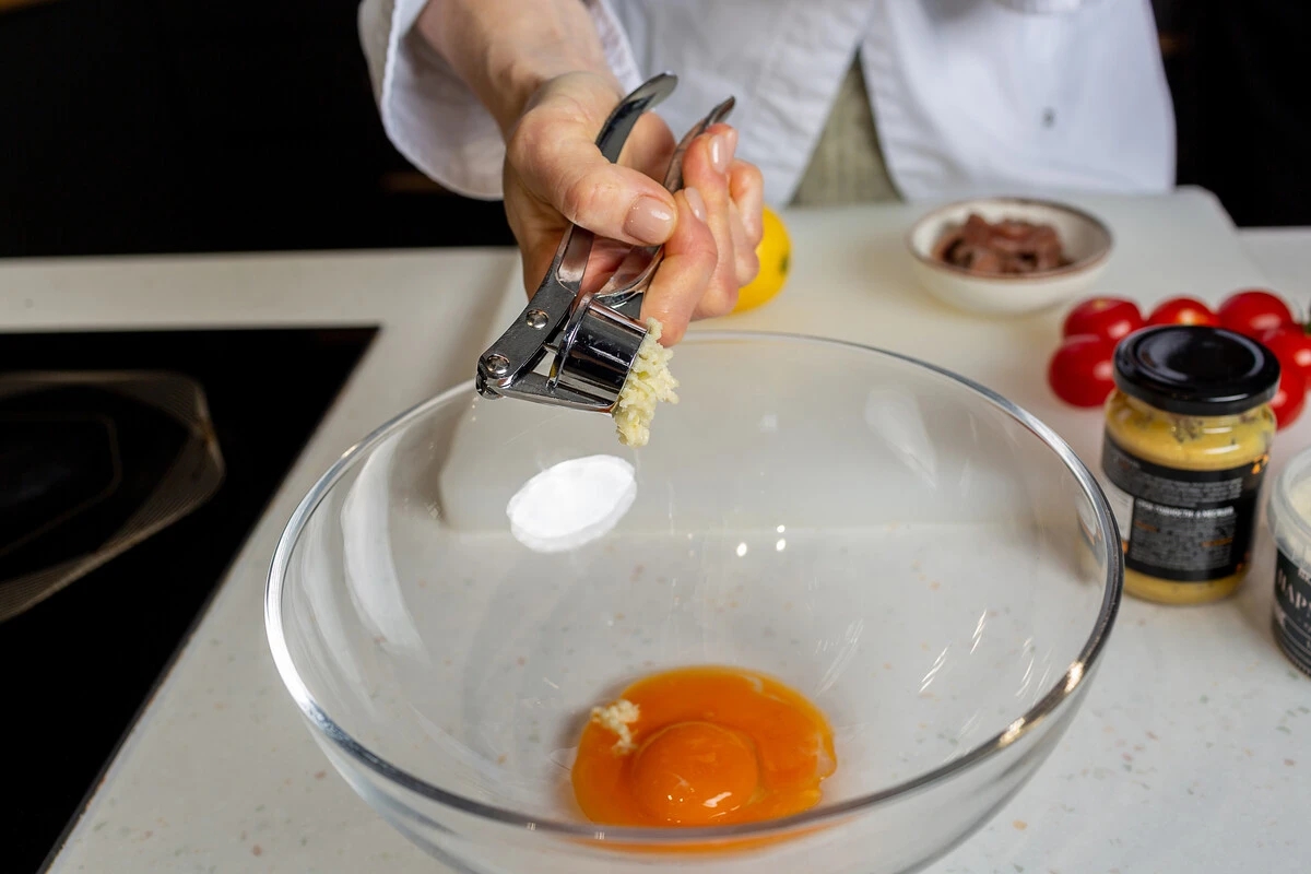 Отделите желтки от белков. В рецепте «Цезаря» вам понадобятся только желтки, а белки можно использовать для приготовления, например, белкового омлета, безе, меренгового рулета. Желтки положите в миску.