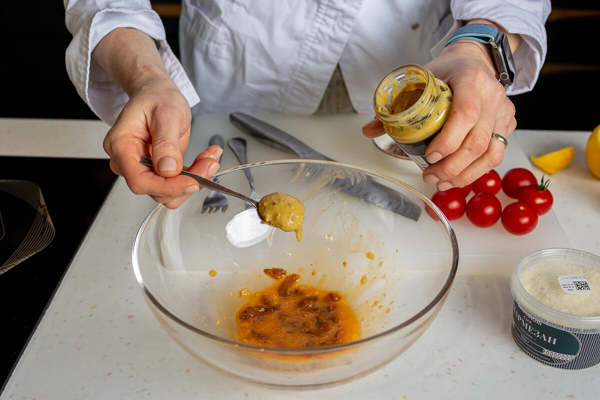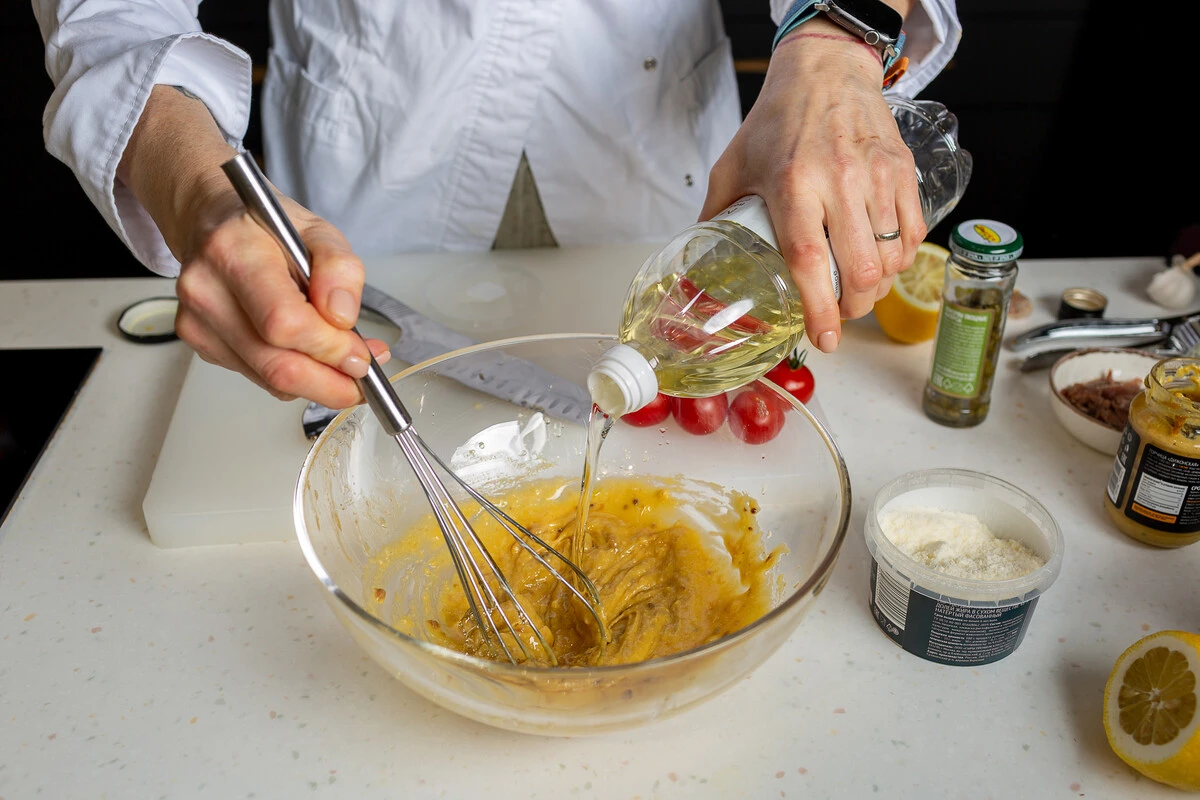 Положите дижонскую горчицу и, продолжая растирать будущую заправку вилкой, вливайте по чуть-чуть оливковое масло. Добавьте тёртый пармезан и снова перетрите всё вилкой.