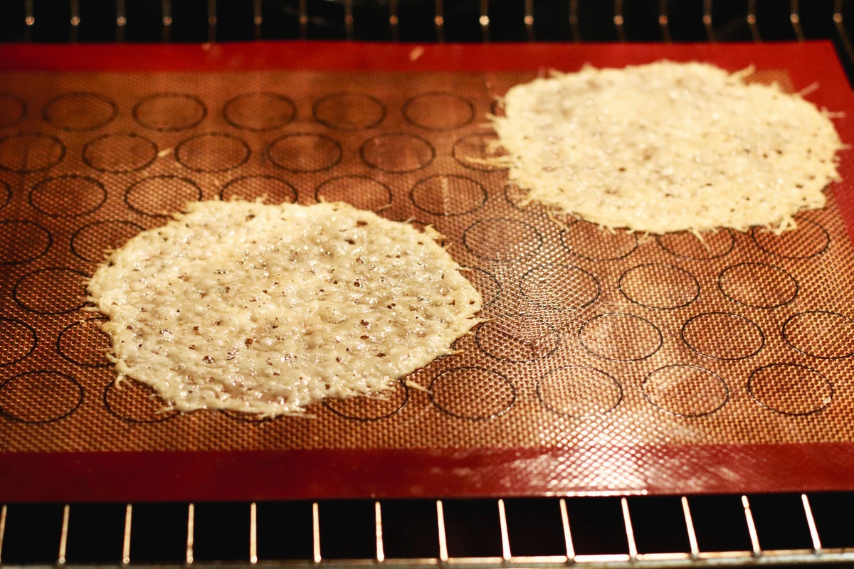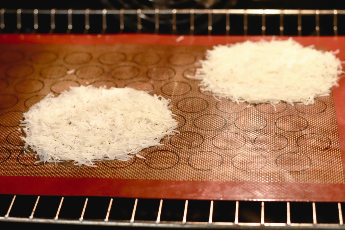 Натрите пармезан на мелкой тёрке. Распределите сыр в форме кругов по силиконовому коврику.