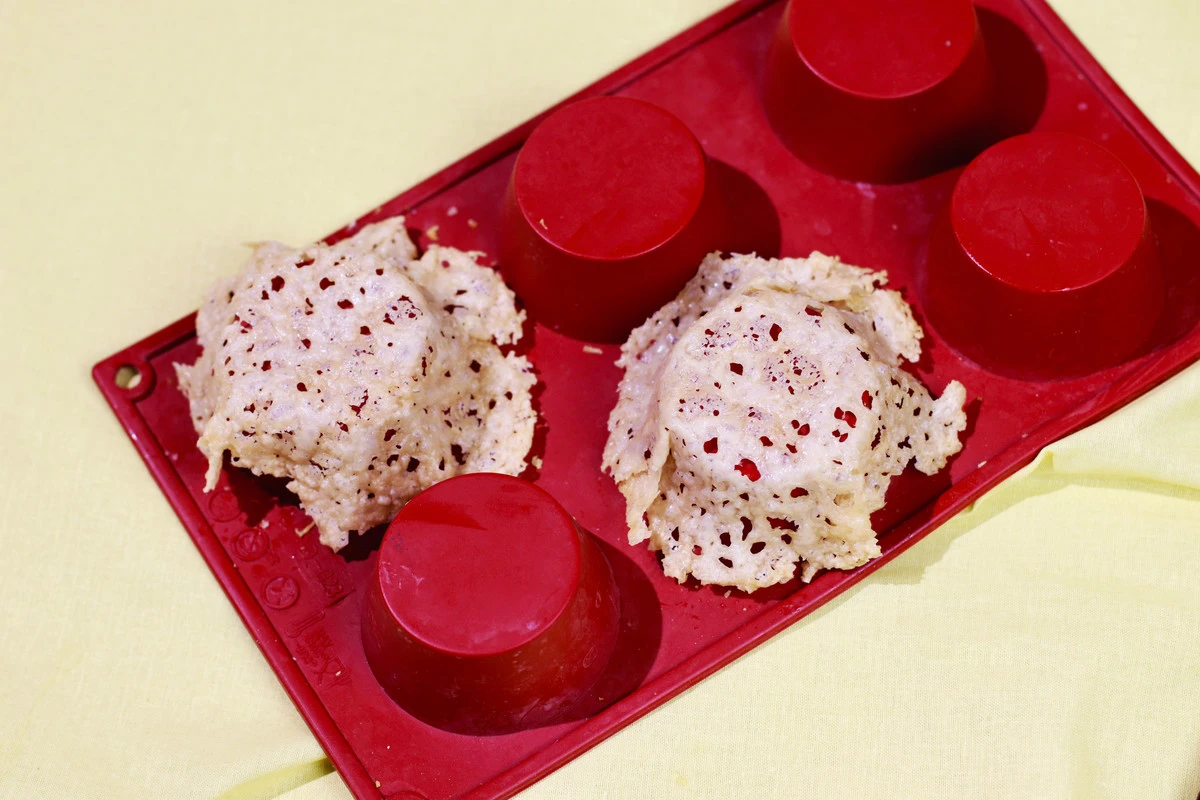 Переложите ещё горячие сырные лепёшки на форму для кексов и прижмите сверху, чтобы получилась корзинка.