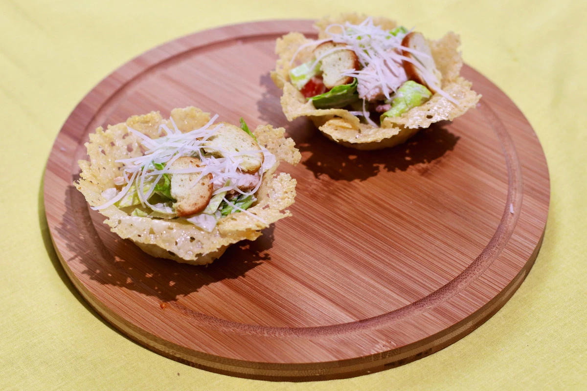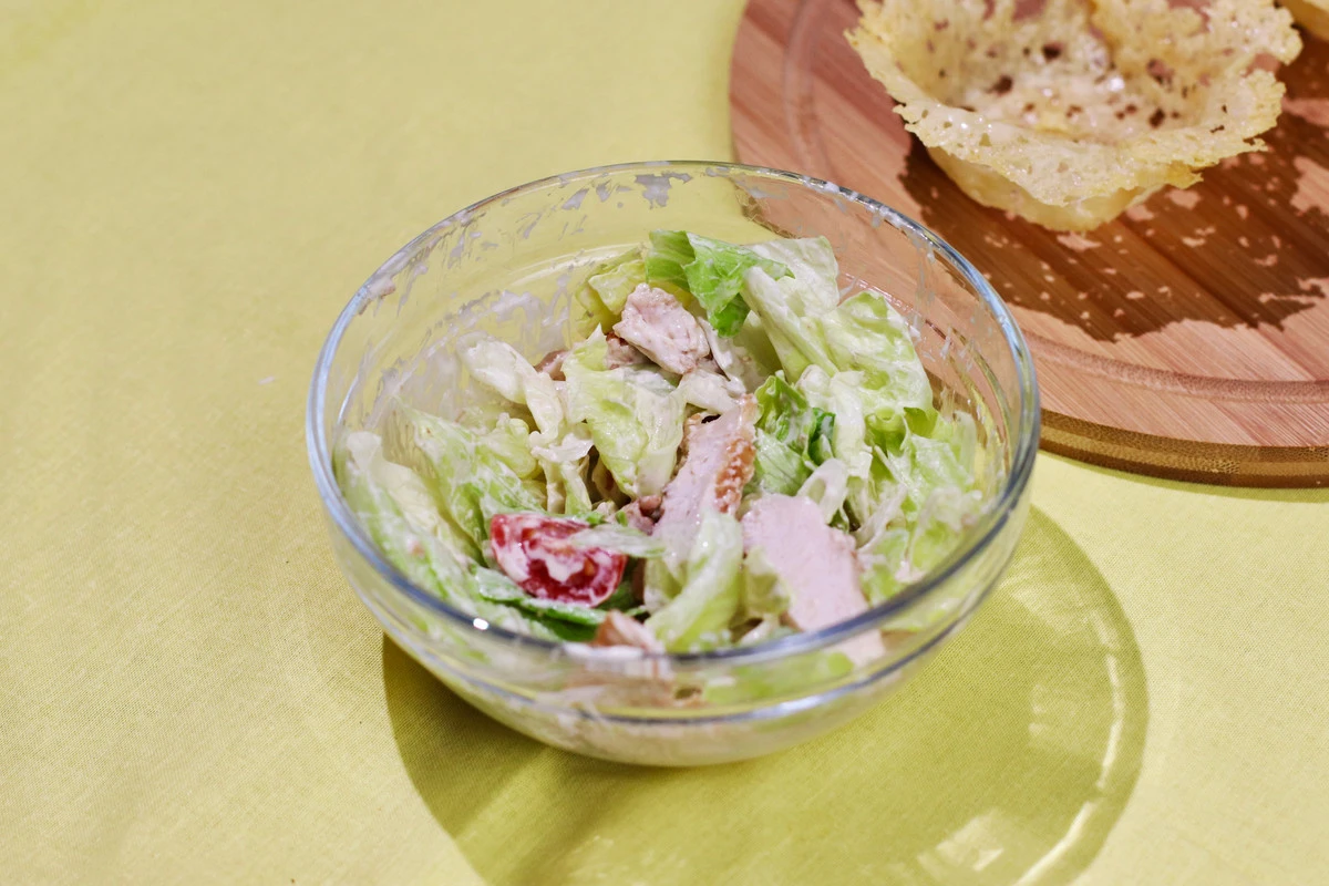 Салат цезарь — это классика, которая не выходит из моды. Но если добавить немного креативности, можно превратить привычное блюдо в нечто необычное. В этой версии оно подаётся в сырных корзинках, сделанных из пармезана. Такой салат станет отличным украшением как для праздничного стола, так и для романтического ужина.