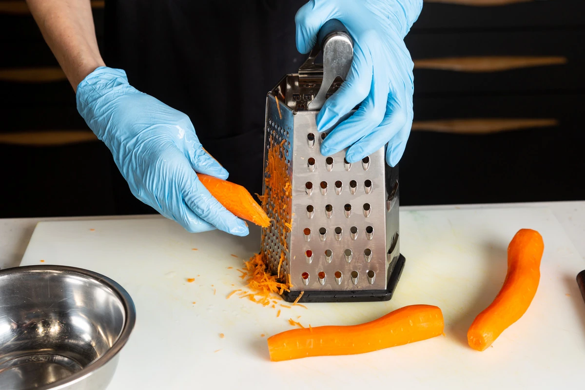 Для «мандариновой кожуры» отварите оставшуюся морковь, остудите и натрите на крупной тёрке. Слегка отожмите получившуюся массу.